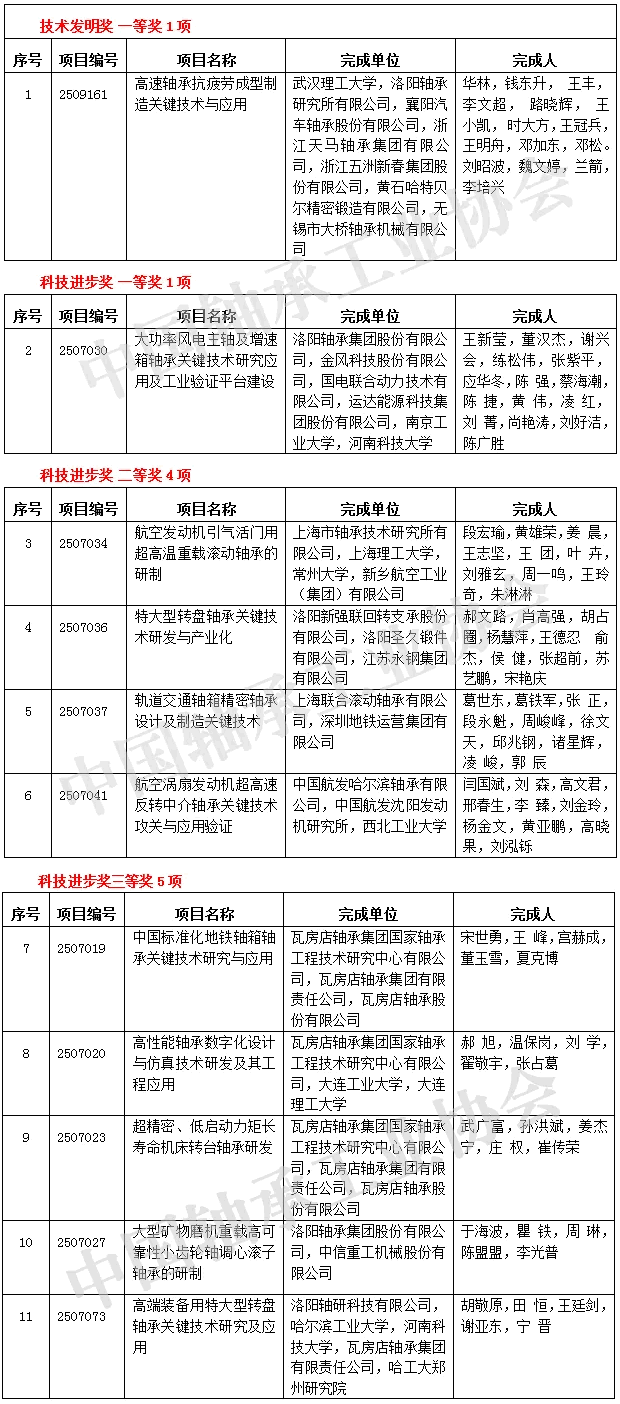 2025年10月23日,中国机械工业联合会、中国机械工程学会发文公布了2025年度“机械工业科学技术奖”授奖项目,表彰奖励项目共541项,其中,特等奖5项、一等奖49项、二等奖232项、三等奖255项。轴承行业11项成果获奖,其中一等奖2项,二等奖4项,三等奖5项。具体名单如下:
